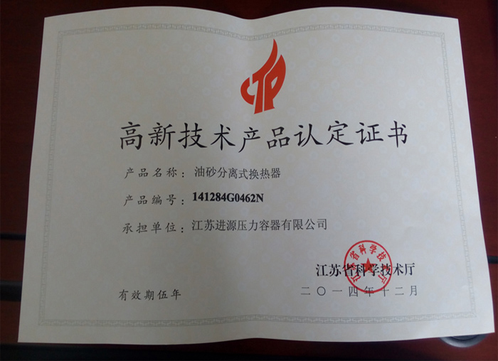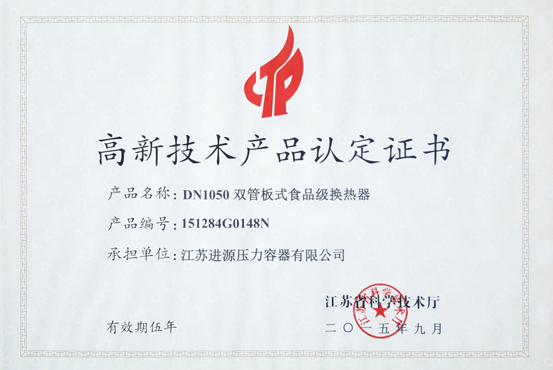 高新技術(shù)產(chǎn)品認(rèn)定證書(shū)-雙管板式食品級(jí)換熱器